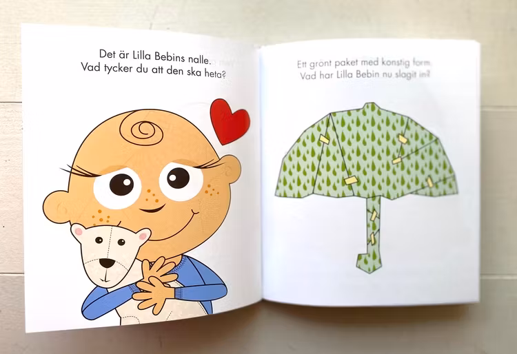 I Lilla Bebins paket får läsaren gissa vad Lilla Bebin har slagit in i olika paket. Gissa, lek och lär!