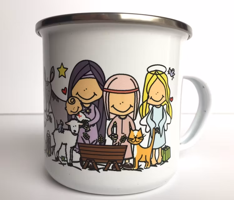 Emaljmugg med motiv julkrubba.