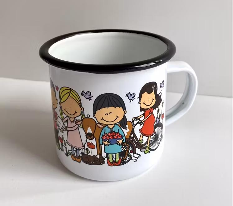 Emaljmugg med motivet "På landet" Bilden sträcker sig runt muggen.