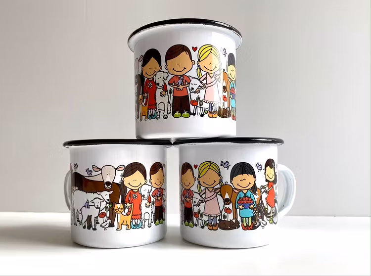 Muggarna är brända för hand med miljövänliga färger. Varje mugg är unik och kan skilja sig lite i utseende och emalj.